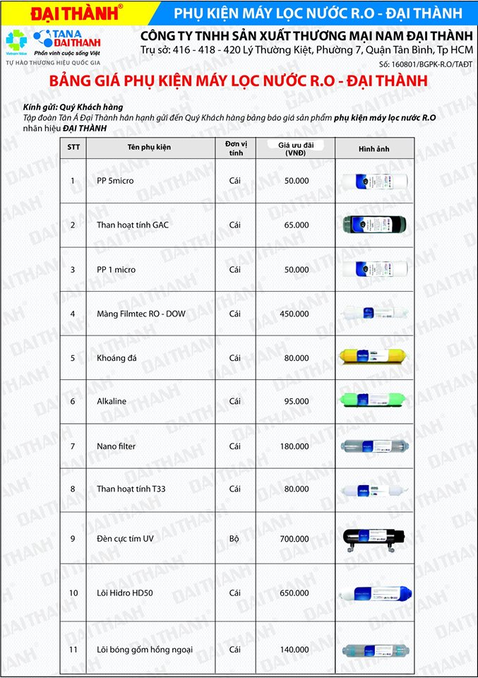 2. BẢNG GIÁ lÕI LỌC VÀ PHỤ KIỆN: